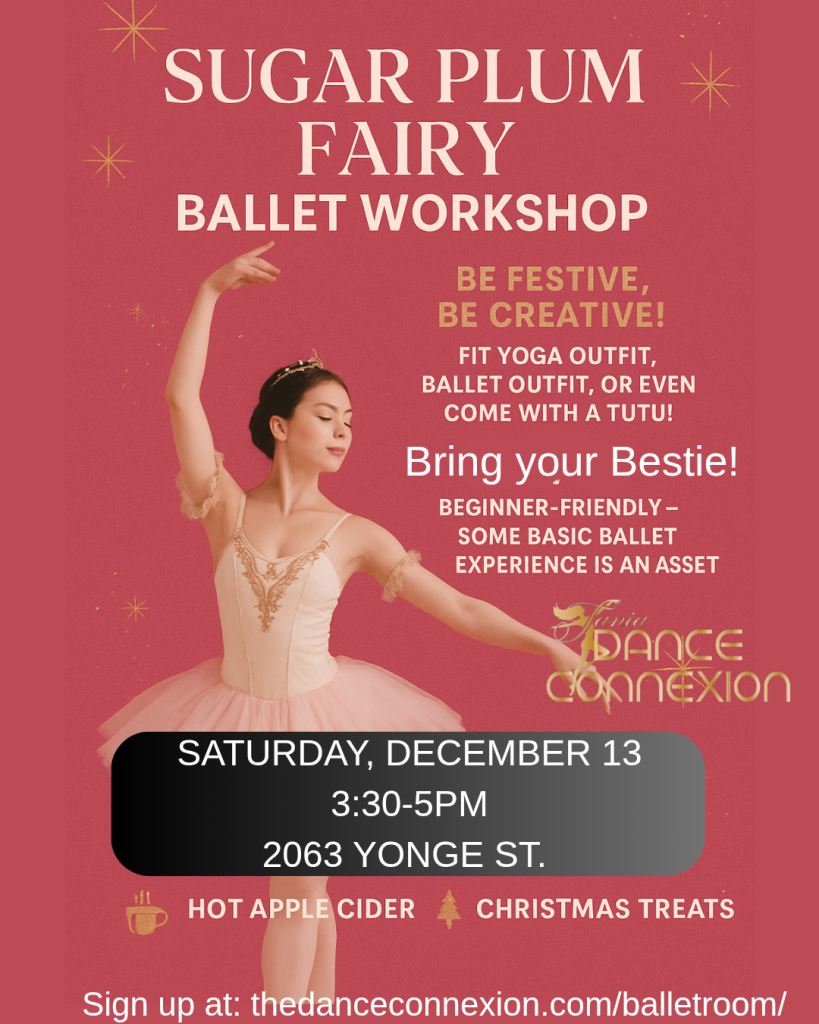 We’ll begin with a festive ballet barre warm-up, then learn a beautiful Sugar Plum Fairy choreography perfect for the season. After dancing, enjoy hot apple cider and Christmas treats with the group.